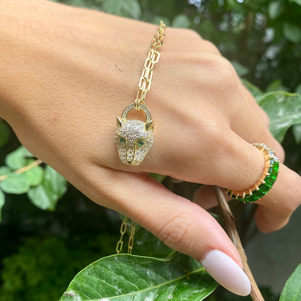 Take your going-out look to new heights with Em + Liv's CZ paperclip pendant necklace. The Aria Necklace features a stunning panther with emerald CZ stones, set into a dainty paperclip chain. Pair this gem with a couple of classic chains for a glamorous, layered look. Perfect for any occasion!