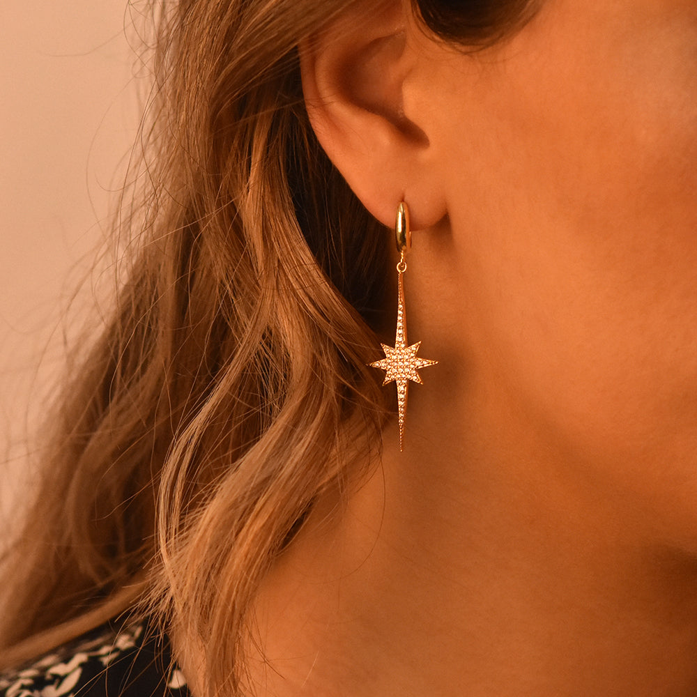 Sparkle in our CZ starburst drop earring. The Aster Earring features a single starburst pendant that dangles with elegance from a 14K Gold Plated earring. This stunner will simply glow wherever and whenever you wear it.