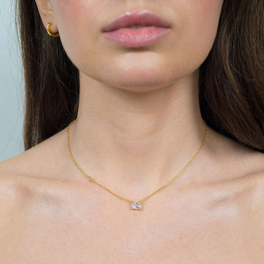 Evoke a sophisticated style in Em + Liv's Emerald Cut Solitaire Necklace. The Grace Necklace features a dainty Sterling Silver chain coated in 14K Gold. Pair this with any of your favorite chokers to get the desired look we all want and need!